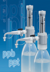 The Dispensette® TA provides outstanding performance for precise-volume dispensing of high-purity media for trace analysis. The components of the fluid path have been selected to only contain the highest purity materials, such as fluoroplastics and sapphire. Depending on application, either platinum-iridium or tantalum valve springs can be chosen. The volume range is from 1 to 10mL. - Especially well suited for dispensing acids, bases and hydrogen peroxide. - Trace metal content of dispensed liquid is generally in the low ppb range, or, depending on application, even in the low ppt range. Dispensing of high-purity chemicals in trace analysis - Plastics in contact with media consist of high-purity materials such as PTFE, ETFE, FEP, and PFA. The purest sapphire is used for replaceable valves. Depending on the application, platinum-iridium or tantalum are available as spring materials. - A field-tested cleaning process before use in trace analysis is described in the operating manual. - If contamination of the bottle contents must be avoided, we recommend using the device without the removable SafetyPrime™ recirculation valve. - The 45mm standard thread plus the included adapters fits most common lab bottles. - The valve block can be rotated 360° so that the bottle label always faces the user for safety. - Telescoping filling tube adjusts to different bottle sizes. - Easy to disassemble for replacement of the dispensing cartridge. Replaceable Dispensing Cartridge If the piston seal is worn after a long period of use, the entire dispensing cartridge can easily be replaced without tools by the user. The cartridge is fully adjusted at the factory, and delivered with a performance certificate. No calibration is required after replacement.